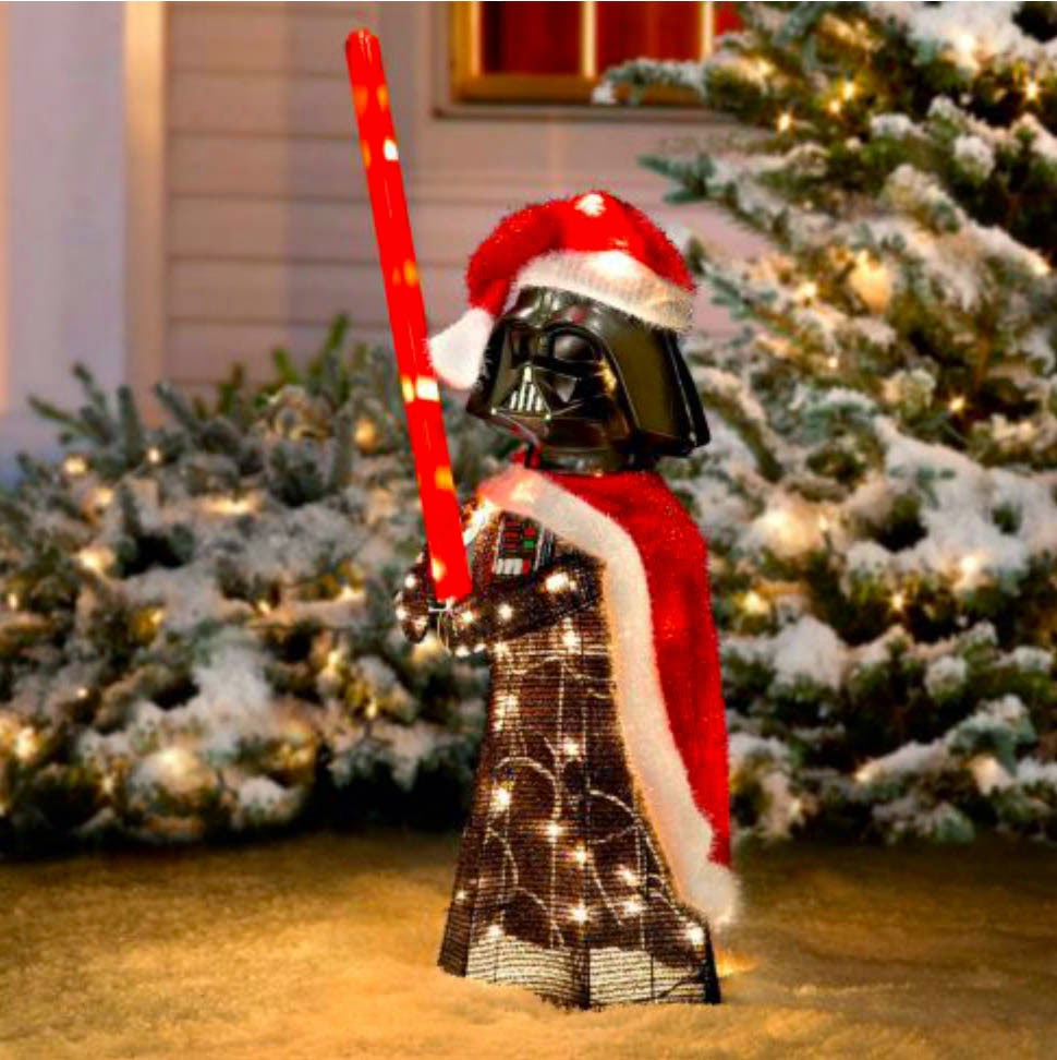 I’m sure Darth’d rather be spinning in his grave with deep humiliation if he only knew he’d be paired with Yoda in a Santa suit. Darth won’t go that far, but he awkwardly holds a candy cane just to show he can be a good sport about these things.