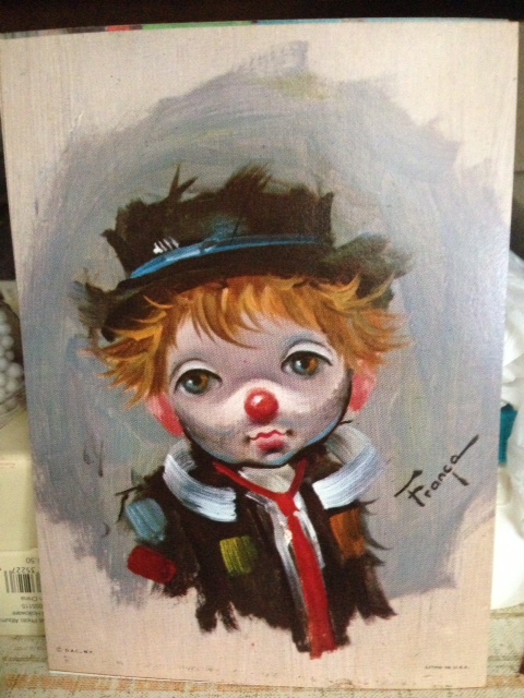 It hit me then: this one’s from that Twilight Zone episode, “The Eye of the Beholder.” In it, pig people valiantly try to plastic surgery-ize a gorgeous woman, regarded by the Piggians as hideously ugly. Perhaps the young, confident Pig Girl lifted herself straight from that episode. Charmed her way into the studio of the artist (Frango? Franga? Franca?) and insinuated herself into the Masterpiece collection. She had a partner, too, a clown boy. No siree, Pigitty wasn’t going through life on this planet alone. She had this fella for fun times: