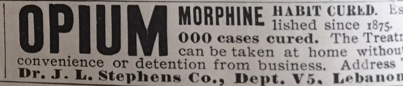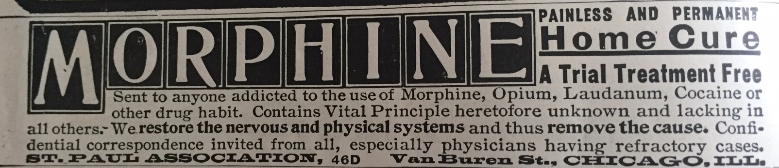 Painless and permanent home cures seem to be the thing. These promise Vital Principle heretofore unknown and lacking in all others, and better still, can be taken without interruption to convenience or detention from business. Again, I’m thinking this is possible because the distressed addict will die, leading to the permanent cure.