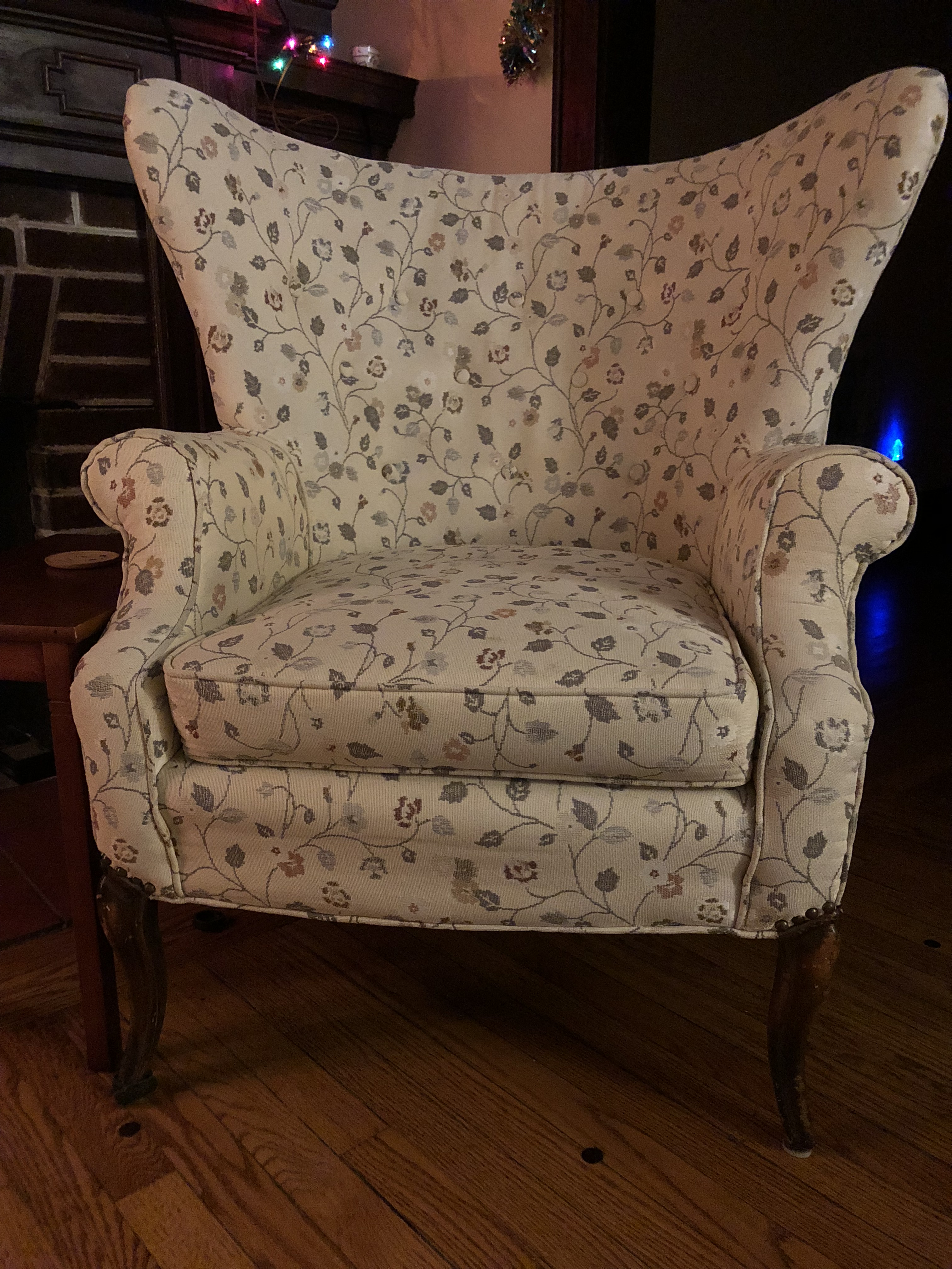 One afternoon, having the day off from the retail job I took to survive, I regarded a chair from my mother’s former bedroom. She’d had it reupholstered in ecru, with a delicate floral pattern tangled in the weave. Mom set it in the corner next to her dresser. She never sat in it. As she approached the end of her run, that chair provided an excellent substitute for her closet. The same shirts and pants she wore day in and out rested on its back and seat. Now it sits in my living room next to the fireplace. I ran my hand across the top, smiled and thought of her. I sat down in it, leaned back and stared out at nothing in particular. My mind emptied.